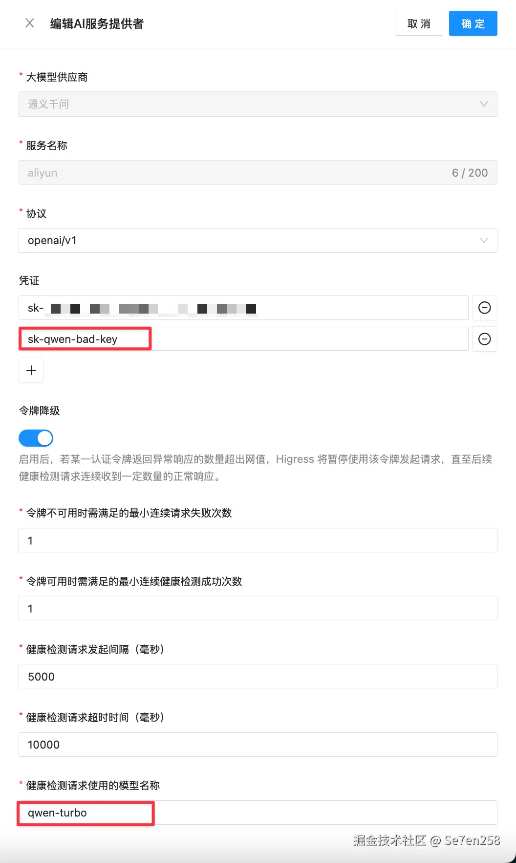 在 AI 服务提供者管理 界面中,为通义千问模型启用令牌降级功能,将健康检测请求的模型设置为 qwen-turbo,其他参数保持默认不变。另外在凭证中分别设置一个可用的 ApiToken 和一个不可用的 ApiToken。