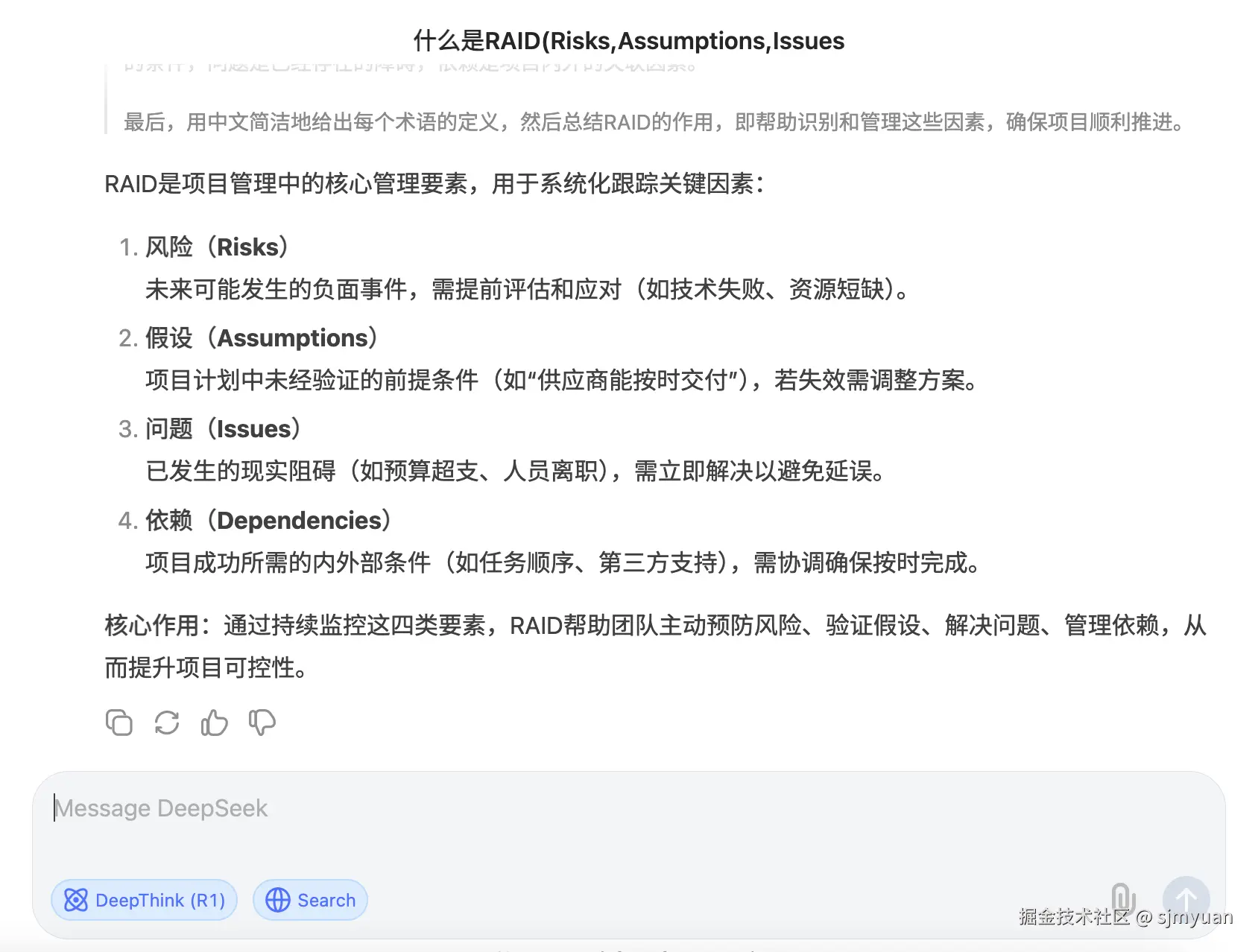 DeepSeek的解释和我的理解是一致的,如果是一个人做RAID分析并没有什么问题,按照自己的理解分析就好了。但在面对一个真实的项目时,特别是当团队无法达成一致时,上述定义就会带来我在文章开头所提出的疑问。