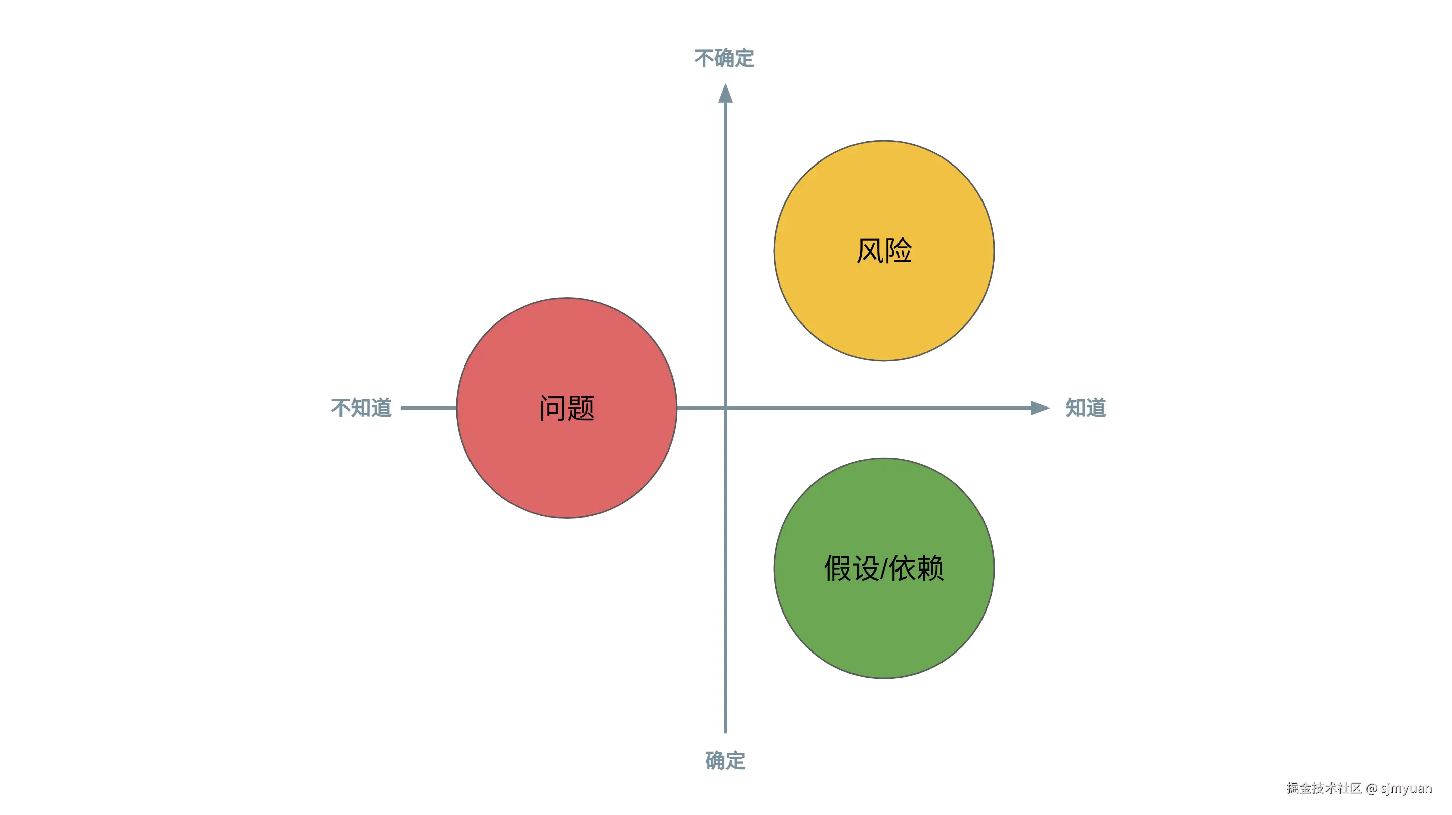问题的定义比较特别,它的两个维度不在同一个时间范围内。认知状态是指问题发生之前的认知状态,很明显,在问题发生之前我们是不知道它的存在的。主观确定度是指问题发生之后的主观确定度,并不是所有的问题在发生之后我们都能确定它是否还会再发生。所以,问题横跨了不知道-确定和不知道-不确定两个象限。