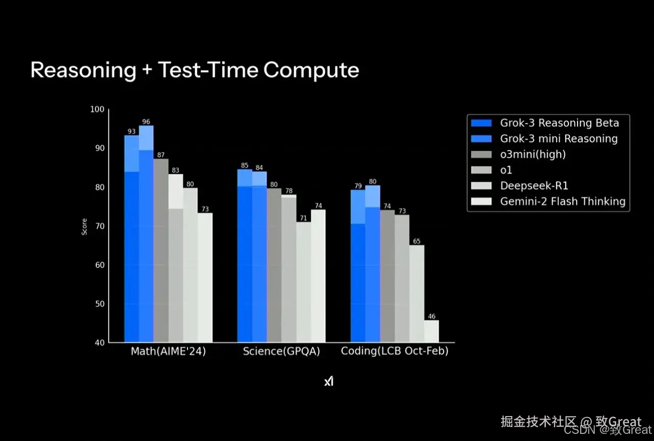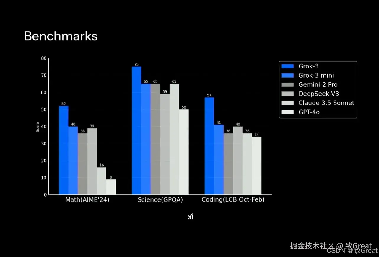 Grok基座模型分别领先了DeepSeek-v3 Gemini和GPT4o;推理模型在benchmark 上得分也高于OpenAI 的o1/o3系列和deepseek-R1模型。