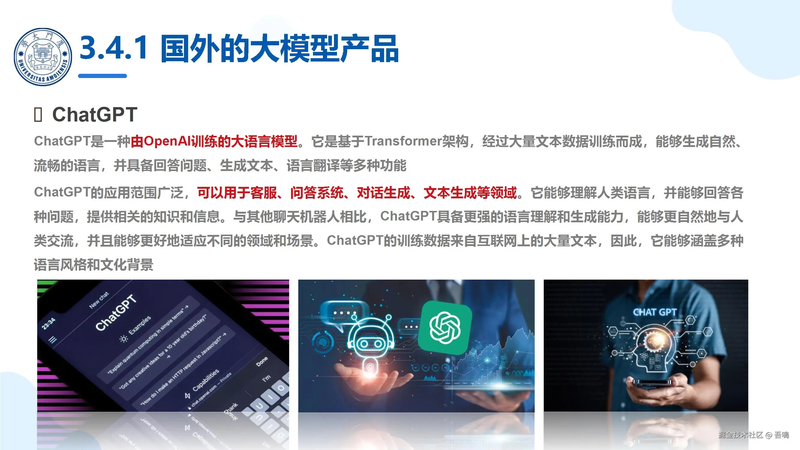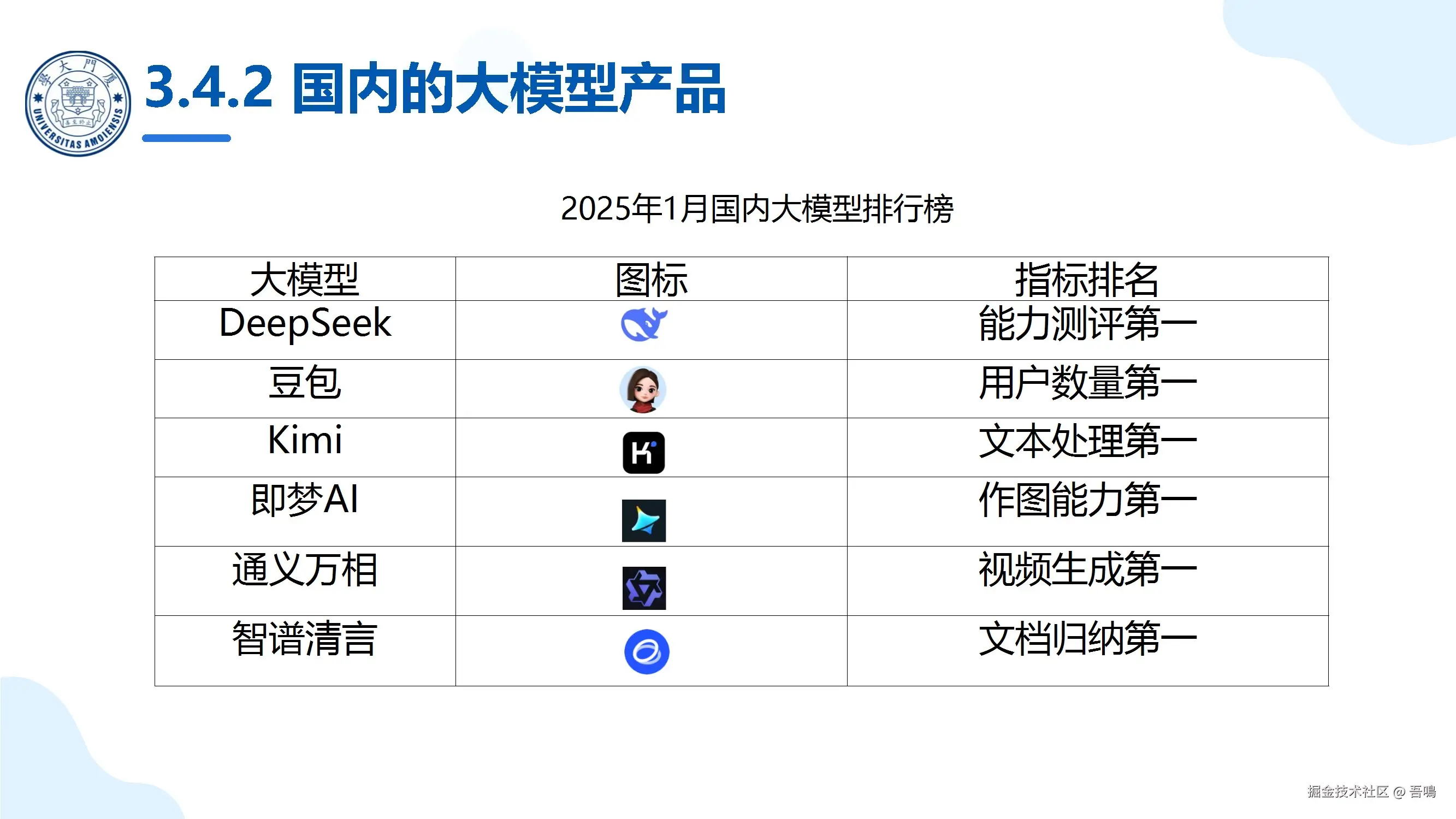 第三部分:人工智能的前沿。 这一章节介绍了国内外的大模型,并且对国内外的主流大模型产品擅长的能力做了一个详细的介绍,能帮助我们很好的了解国内外主流的大模型产品,以便在我们需要AI某种能力的时候(比如文生图、文生音频、文生视频等),可以快速的选择AI大模型为我们工作。