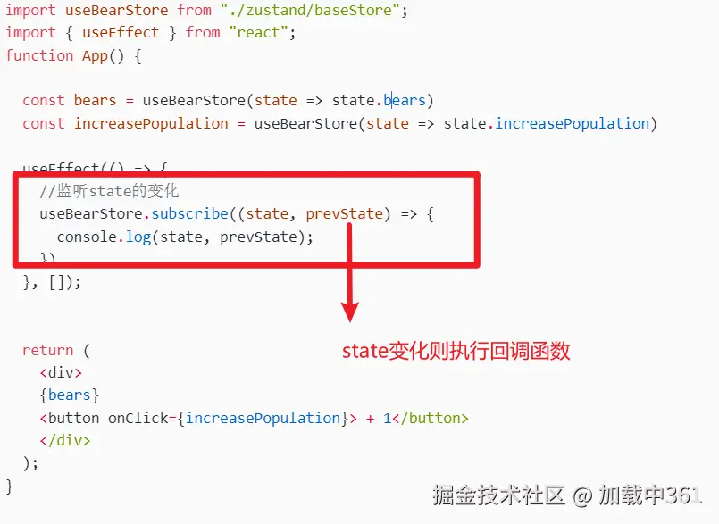 我们只需要在useBearStore的时候增加一个监听,在state变化的时候调用回调函数,回调函数中判断属性是否变化即可。