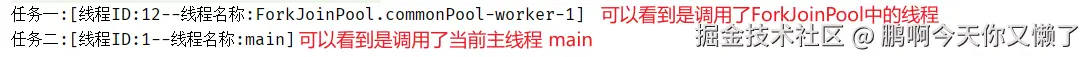 - 对于线程来说:不阻塞-->>可以看到任务二使用的main线程,并不是ForkJoinPool中的线程,也就是使用了主线程来执行任务二,并不是使用线程池中的线程来完成任务二。这里就导致了一个问题,为了任务一执行结束后,需要任务二执行,结果好了main 线程被其他程序的任务使用着,那任务二不得等着那个程序用完 main 再轮到自己嘛。所以为什么说