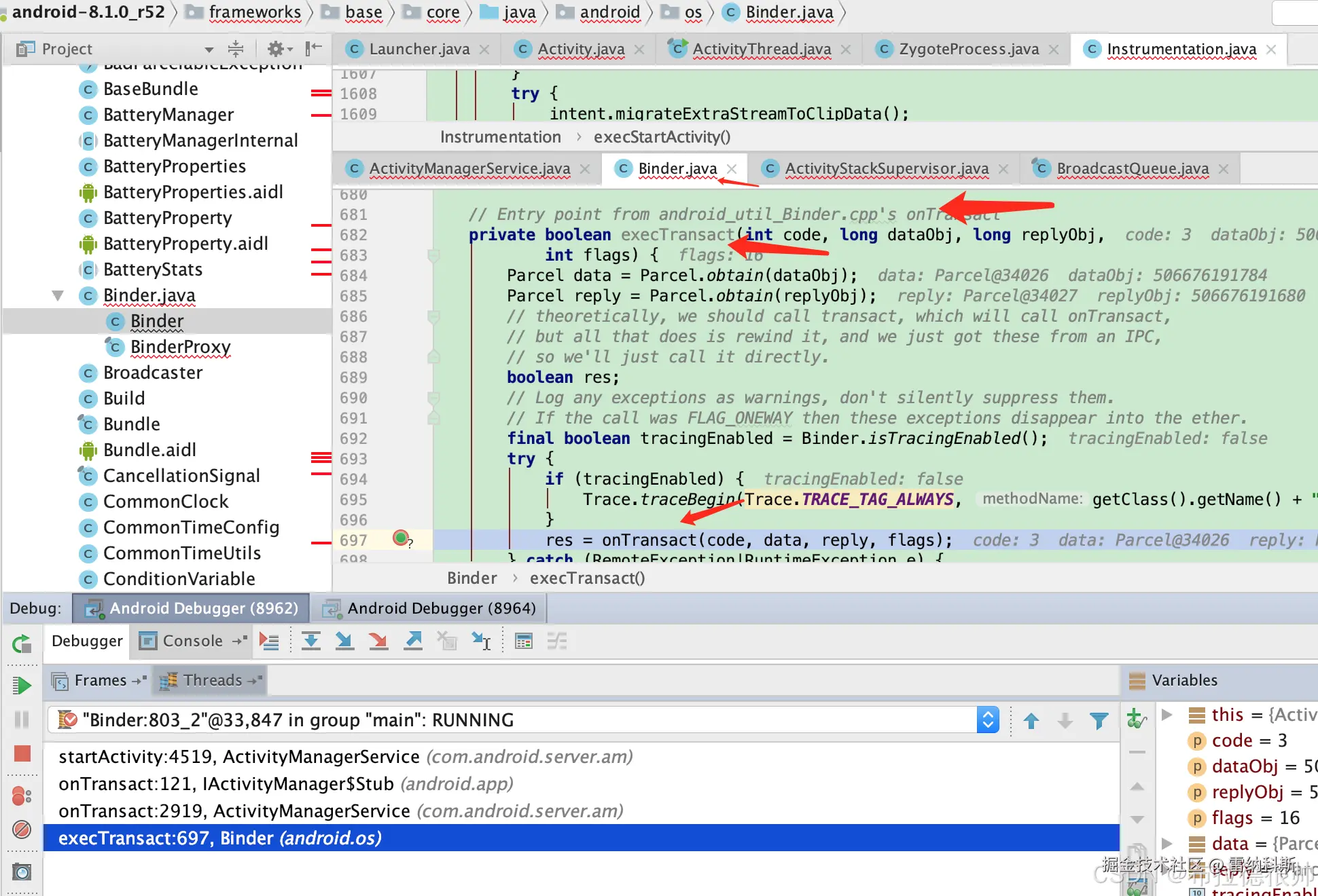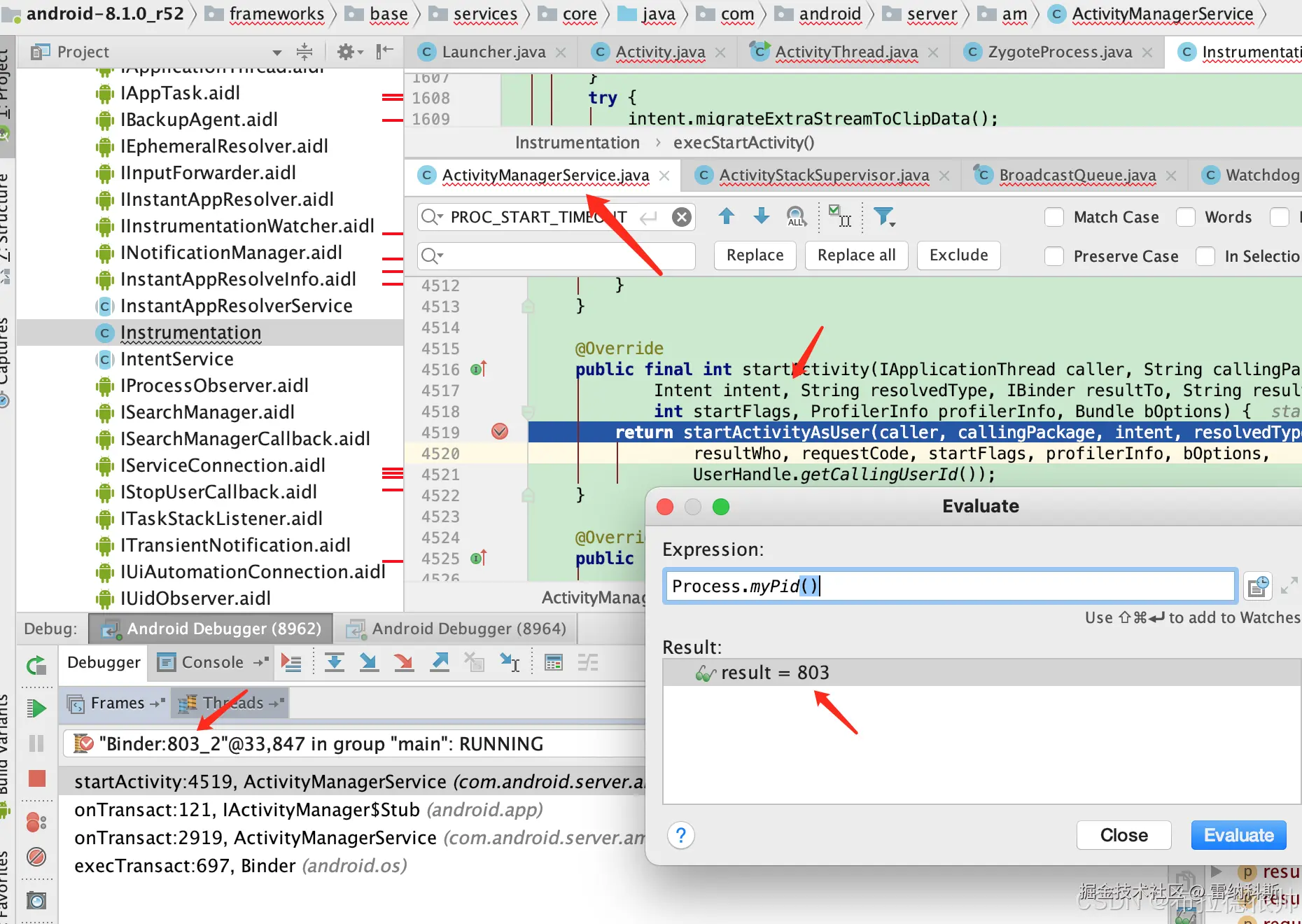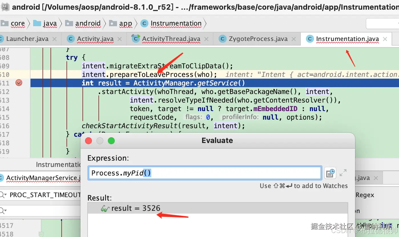 发现在Instrumentation里面调用到ActivityManager.getService这一刻还是在APP进程(pid=3526和命令行里面获取到pid一致),一旦调用到ActivityManager.getService
