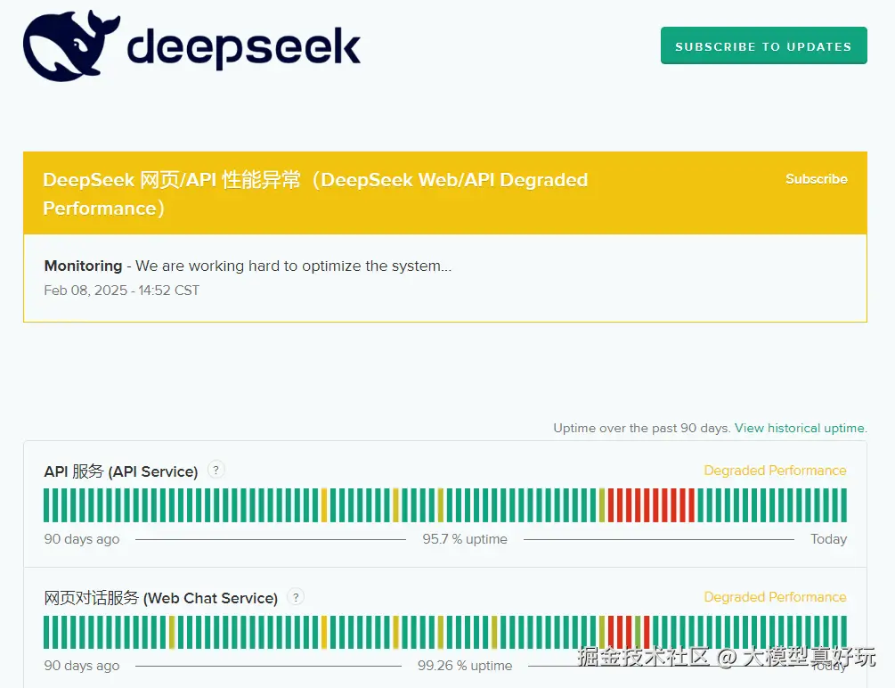 我们可以在 status.deepseek.com/ 网站中查看当前DeepSeek服务器的状态,最近虽比年前好些,但还是会出现性能异常情况,且现在DeepSeek官网因为资源紧张已经暂停了API TOKEN的充值,对新用户不友好。