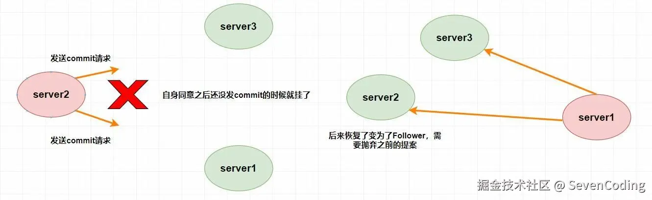 假设 Leader (server2) 此时同意了提案 N1,自身提交了这个事务并且要发送给所有 Follower 要 commit 的请求,却在这个时候挂了,此时肯定要重新进行 Leader 的选举,比如说此时选 server1 为 Leader (这无所谓)。但是过了一会,这个 挂掉的 Leader 又重新恢复了 ,此时它肯定会作为 Follower 的身份进入集群中,需要注意的是刚刚 server2 已经同意提交了提案 N1,但其他 server 并没有收到它的 commit 信息,所以其他 server 不可能再提交这个提案 N1 了,这样就会出现数据不一致性问题了,所以 该提案 N1 最终需要被抛弃掉 。