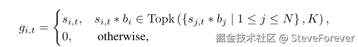 为此,将专家级偏差添加到每个专家的门控分数中,如下图所示。请注意,b_i 不**用于最终的门控分数(正如我们稍后将看到的,这种偏差也是不可微分的),但它在 TopK 中用于选择专家: