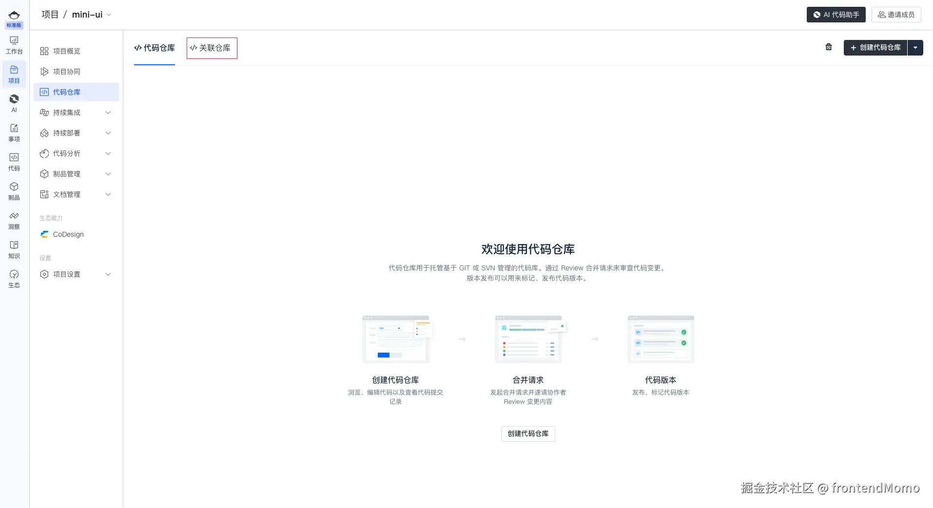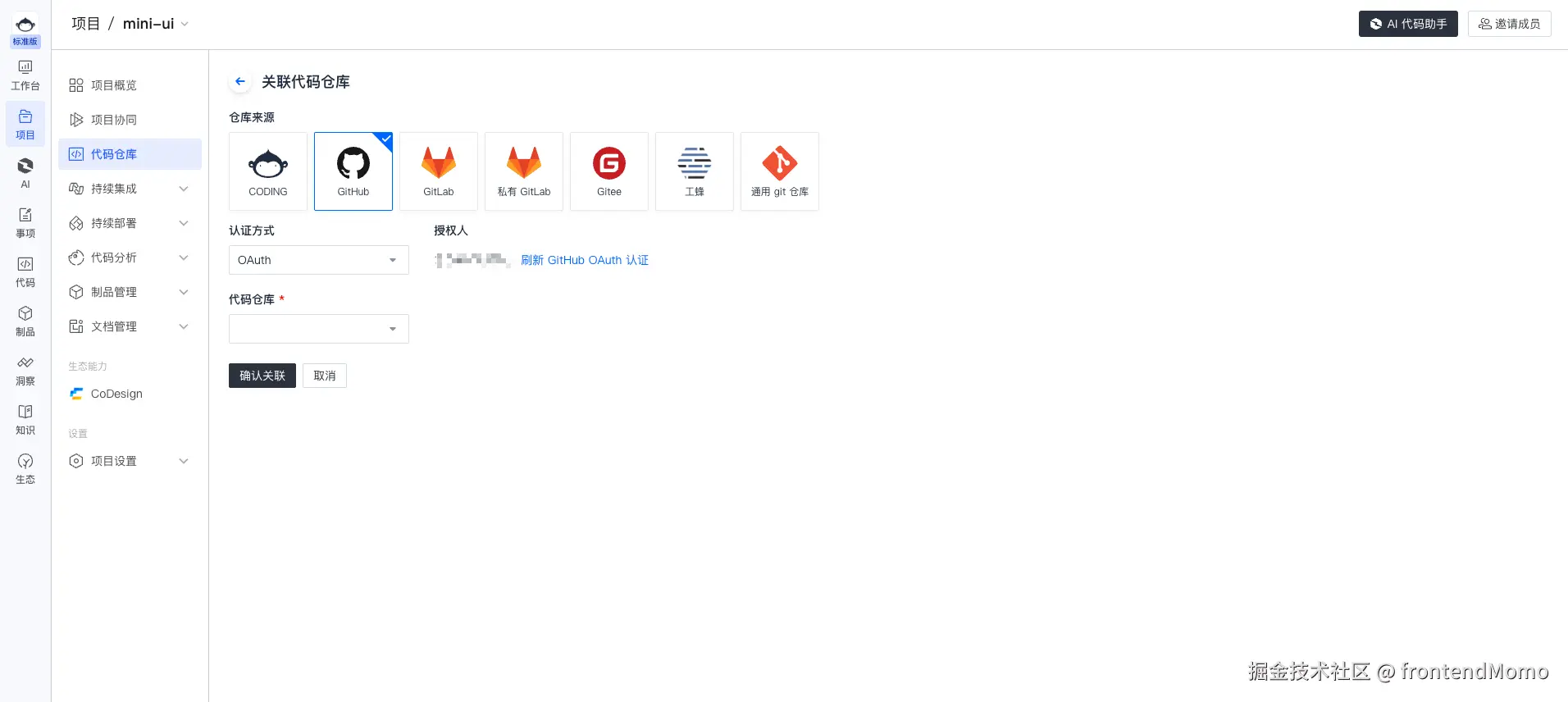 可以选择不同 git 的相关方案,去选择鉴权方式,完成关联后,直接可以选择对应的仓库,还是蛮方便的。