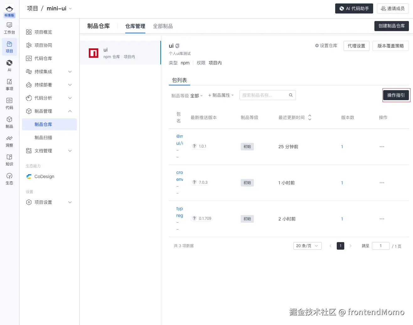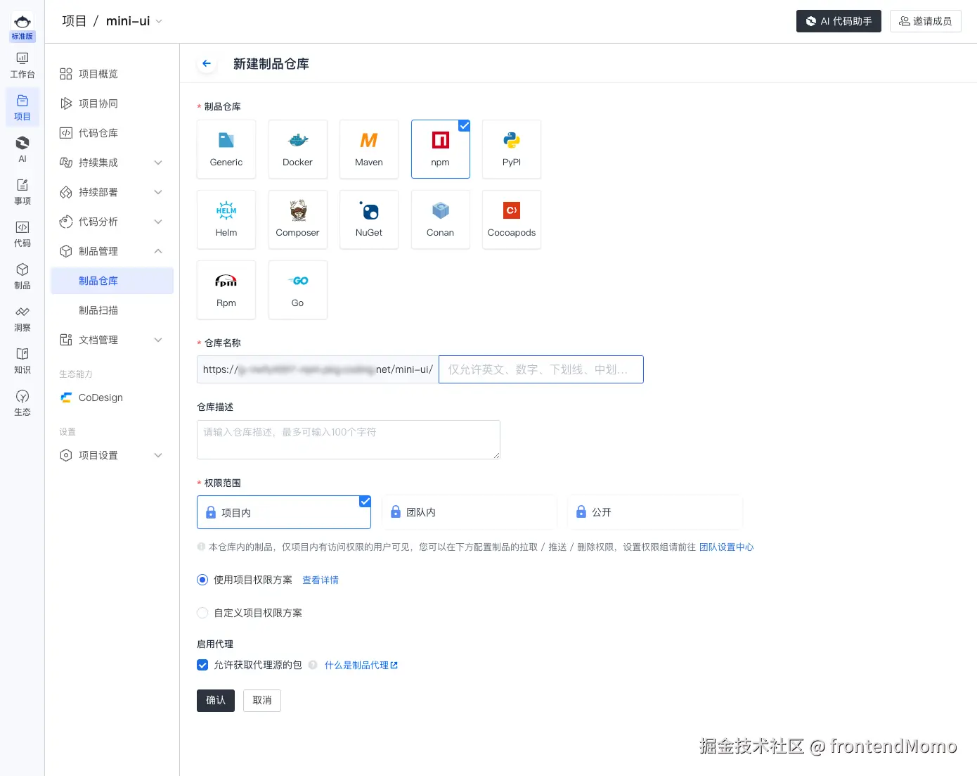 但是为了照顾到公网发布的情况下, 这里的制品库就更像是内网版的 npm 源。公网发布流程与下面的内容很相近,仅仅是无需将 npm 的源设置为 私人制品库的镜像源,保留使用 npm 官方源即可。