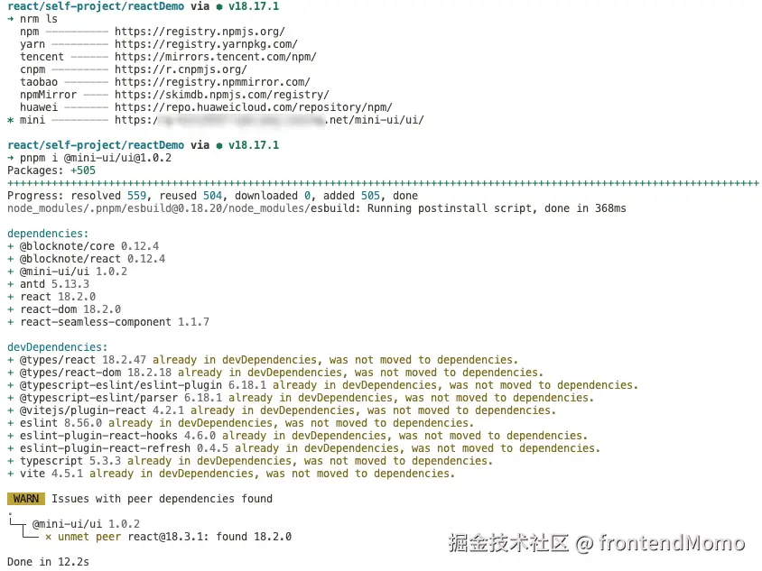 nrm ls查看源是否是配置的源, 最后pnpm i @mini-ui/ui@1.0.2完成组建库包的下载。 -