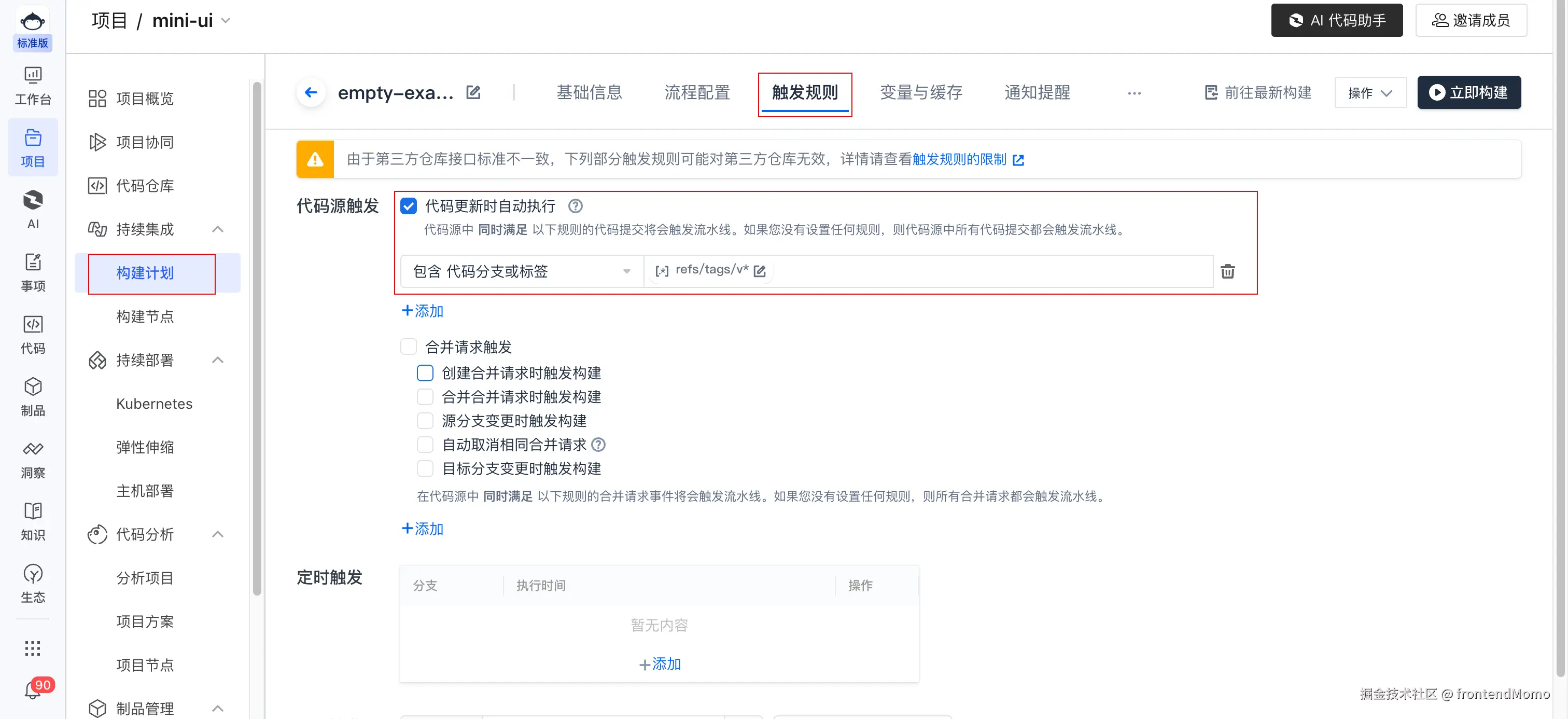 - 点击构建计划,点击触发规则,然后通过正则匹配
