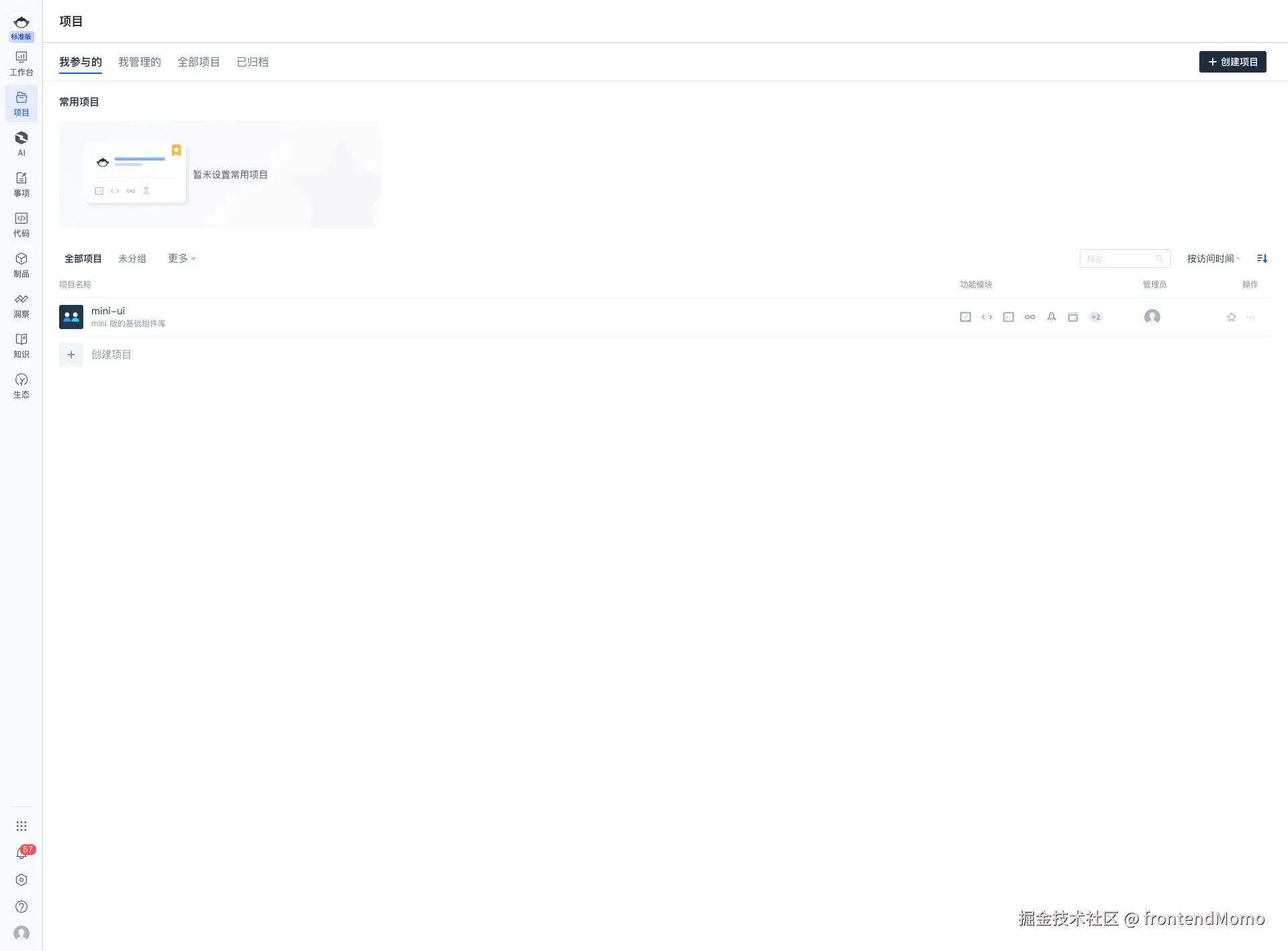点击左侧的目录栏, 选择项目,然后点击右侧的创建项目。