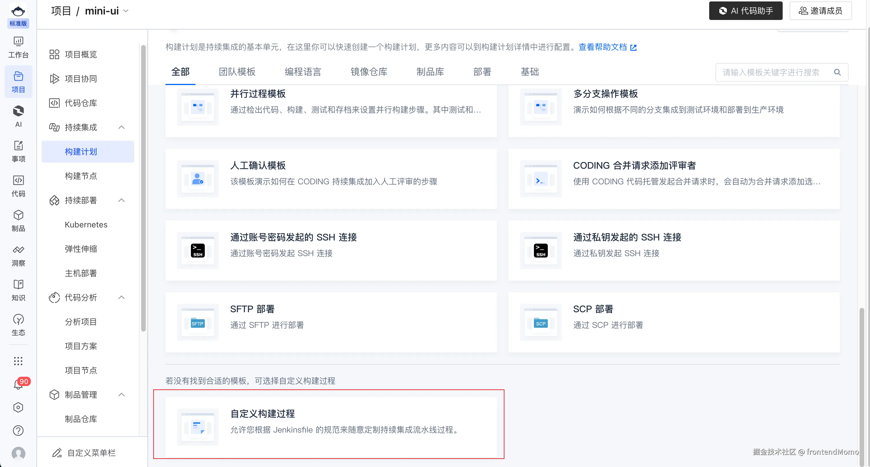 - 点击项目下的 构建计划 子目录, 然后点击新增构建过程,选中自定义构建过程。