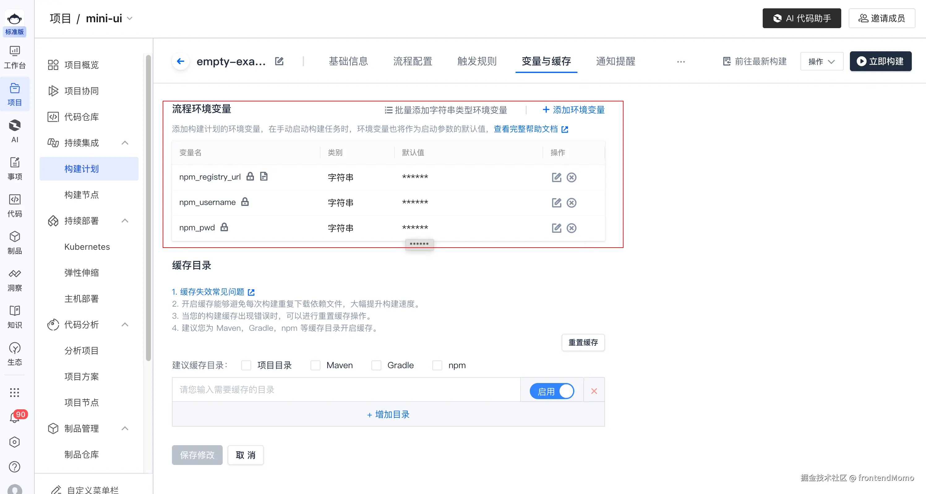 registry制品库的地址,username以及password这三个变量(在上文中获取到的制品库地址, 以及在npm login输入时的账号密码)存储在构建时的变量中,在流程中读取写入到/packages/ui/.npmrc文件,作为发布时的鉴权以及目标地址。 -