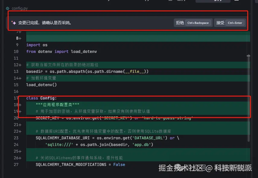 chat生成的代码可以一键生成,生成后可以通过查看diff来确定是否接受,前期可以无脑接受,有问题就修,但后期需要大致看下修改内容,否则可能会埋一些bug。
