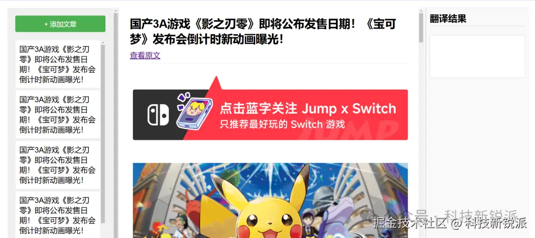 描述功能: “我需要实现一个文章收集器,先做一个基础版的,左边是文章列表,展示文章名称,可以通过+号输入url,这个url是微信公众号的文章链接。当插入url后,默认会在中间展示内容。右边的内容作为辅助工具帮助阅读,可以翻译内容的英文,也可以查询。”