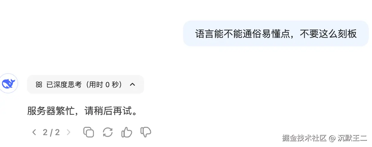 个人感觉,DeepSeek 官网应该是做了限流措施,在一定时间内只能提问一次,连续提问就会直接提示“服务器繁忙、请稍后再试”。