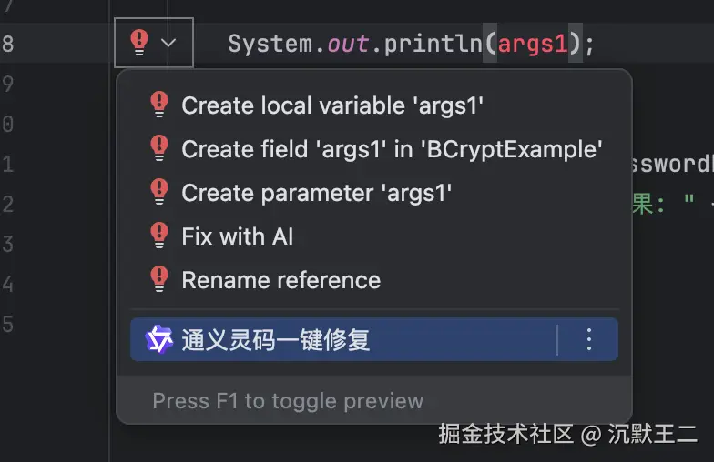 如果不是运行时错误,而是编译型错误,可以把鼠标移动到出错的这行代码,在红色的报错图标下拉菜单中,选择【通义灵码一键修复】。