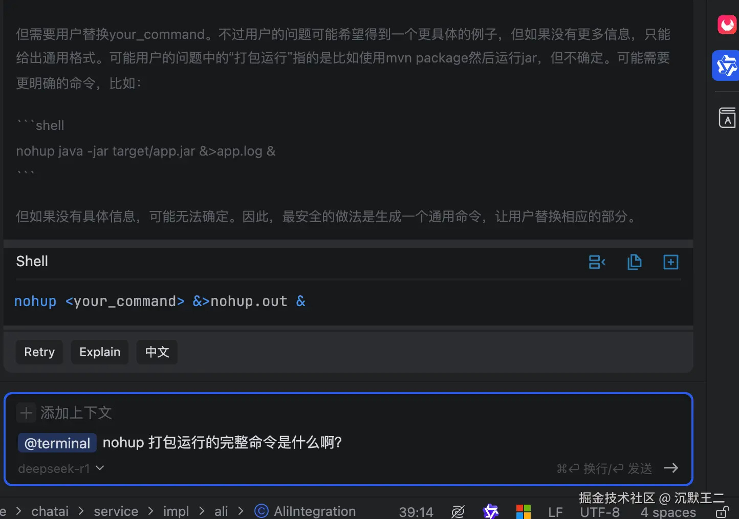 另外,我在智能问答里还发现一个特别好用的功能,就是可以输入 @ 唤起 terminal 终端和本地工程 workspace。