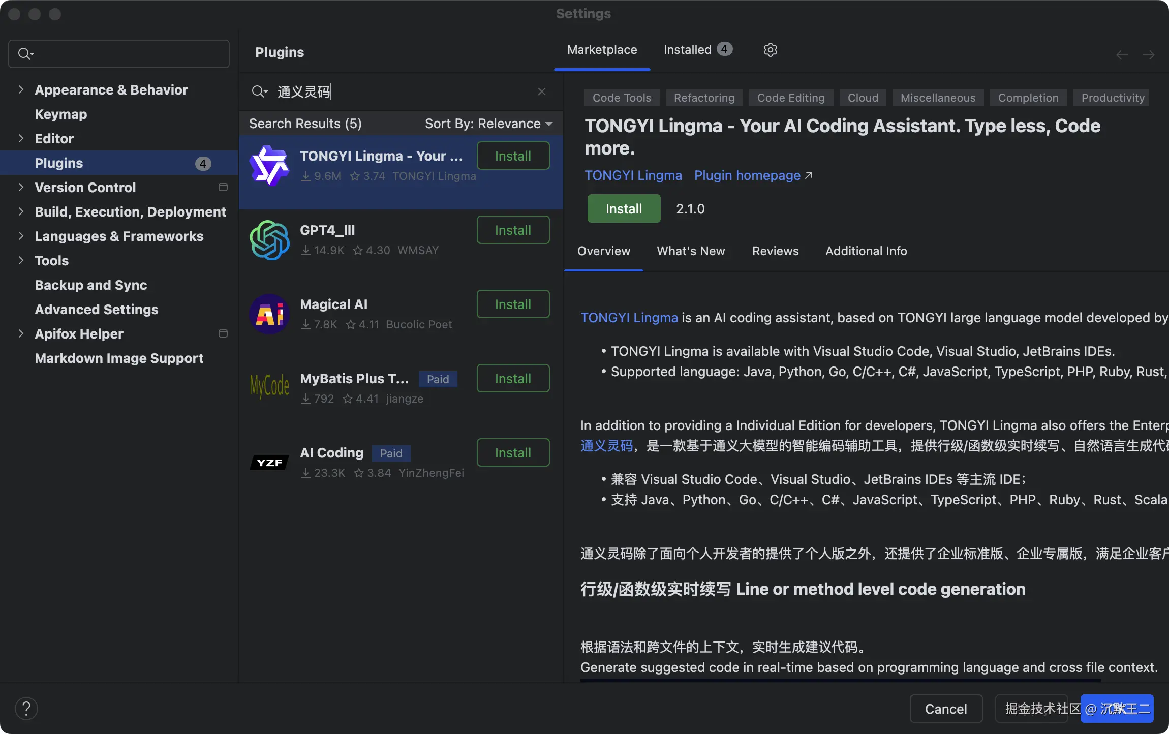 然后点击 install 就可以安装了,支持 Java、Python、Go 等编程语言,VSCode 和 Visual Studio 也可以安装。