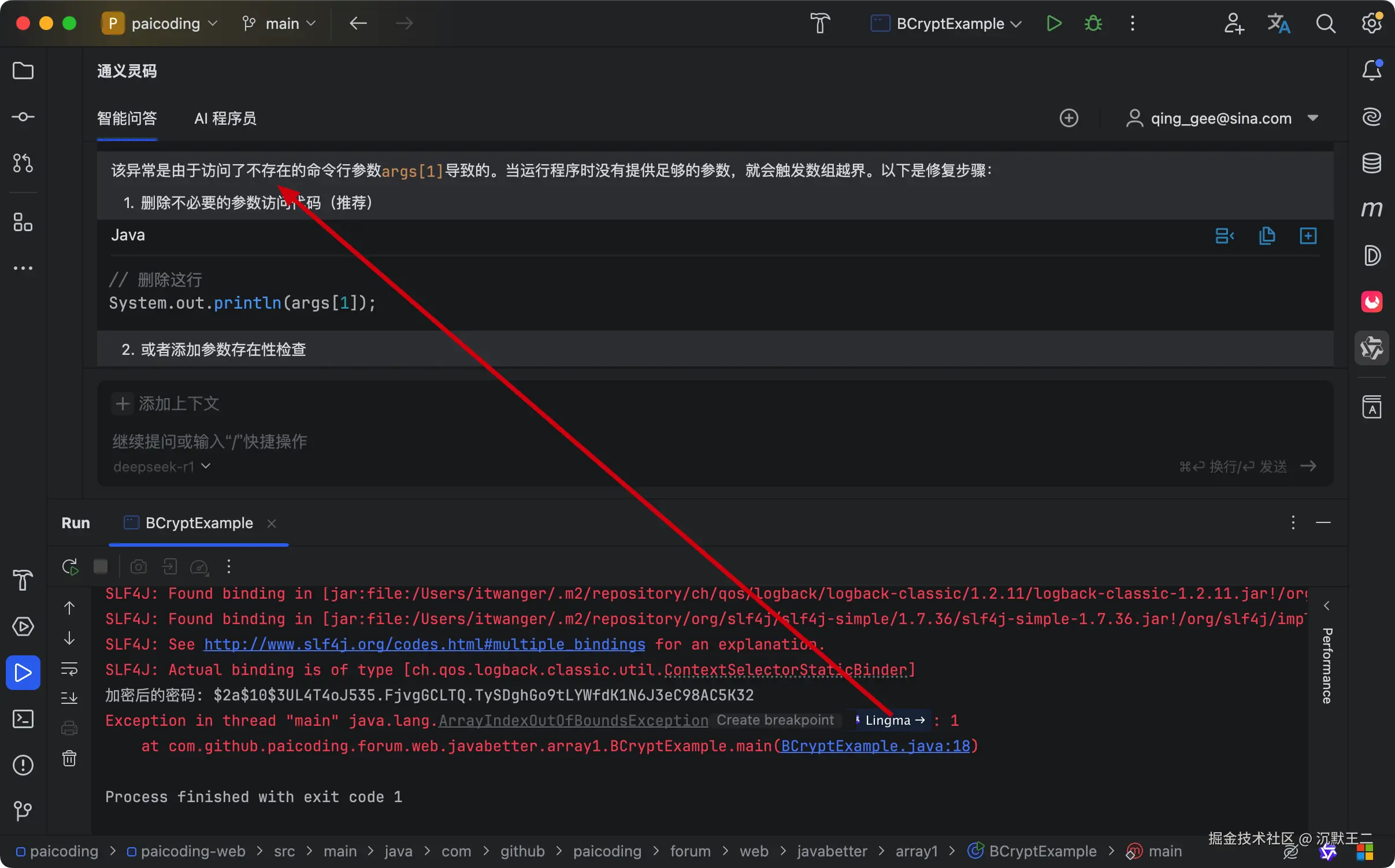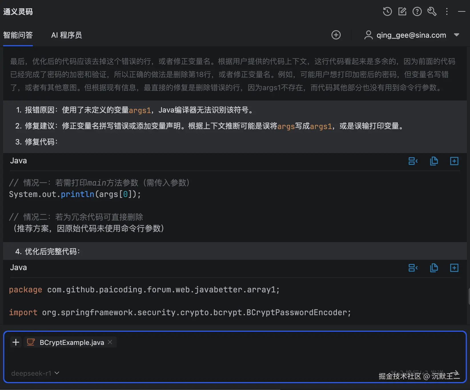 在有错误的地方点击【lingma】,就可以直接跳转到与 DeepSeek R1 的智能问答聊天窗口,错误的修复建议一览无余。