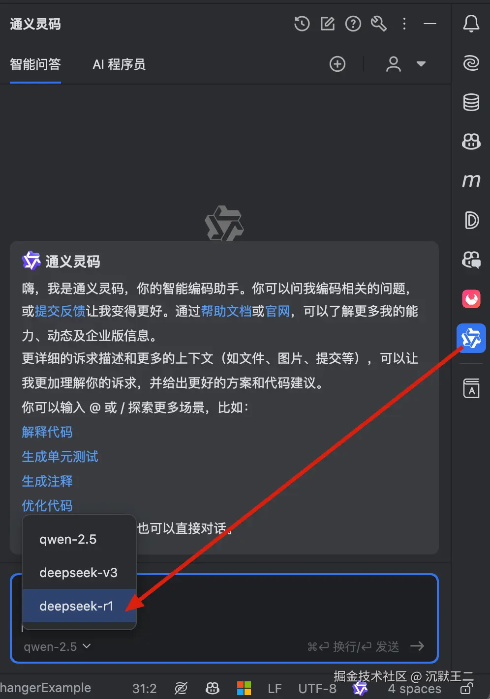 完成安装后,点击右侧边栏上通义灵码的小 icon 就可以打开和通义灵码的聊天窗口。