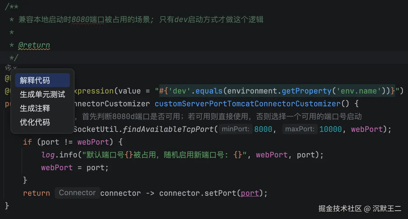 除了解释一个完整的类,每个方法的左上角也会有一个通义灵码的小图标,点击它,就可以调出“解释代码”、“优化代码”、“生成单元测试”等功能,非常方便。