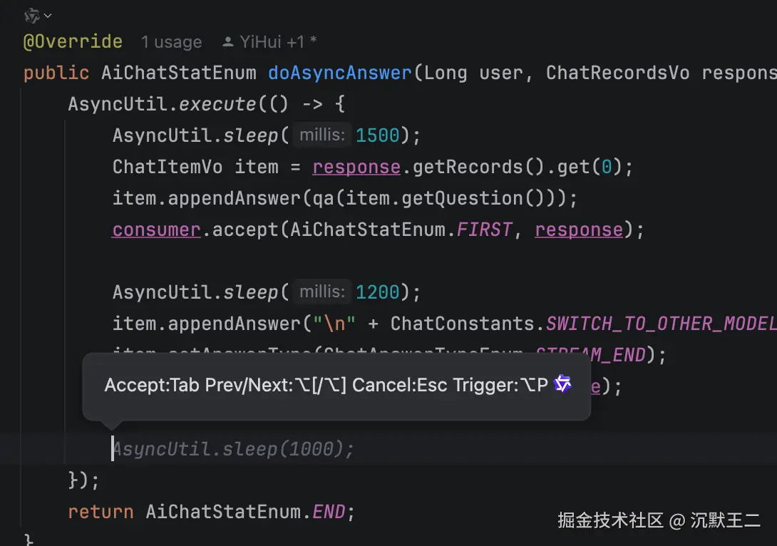 行级代码是最简单的,回车键就可以触发,如果需要多行代码,macOS 是按 option+P 触发,Windows 是按 Alt+P 触发。