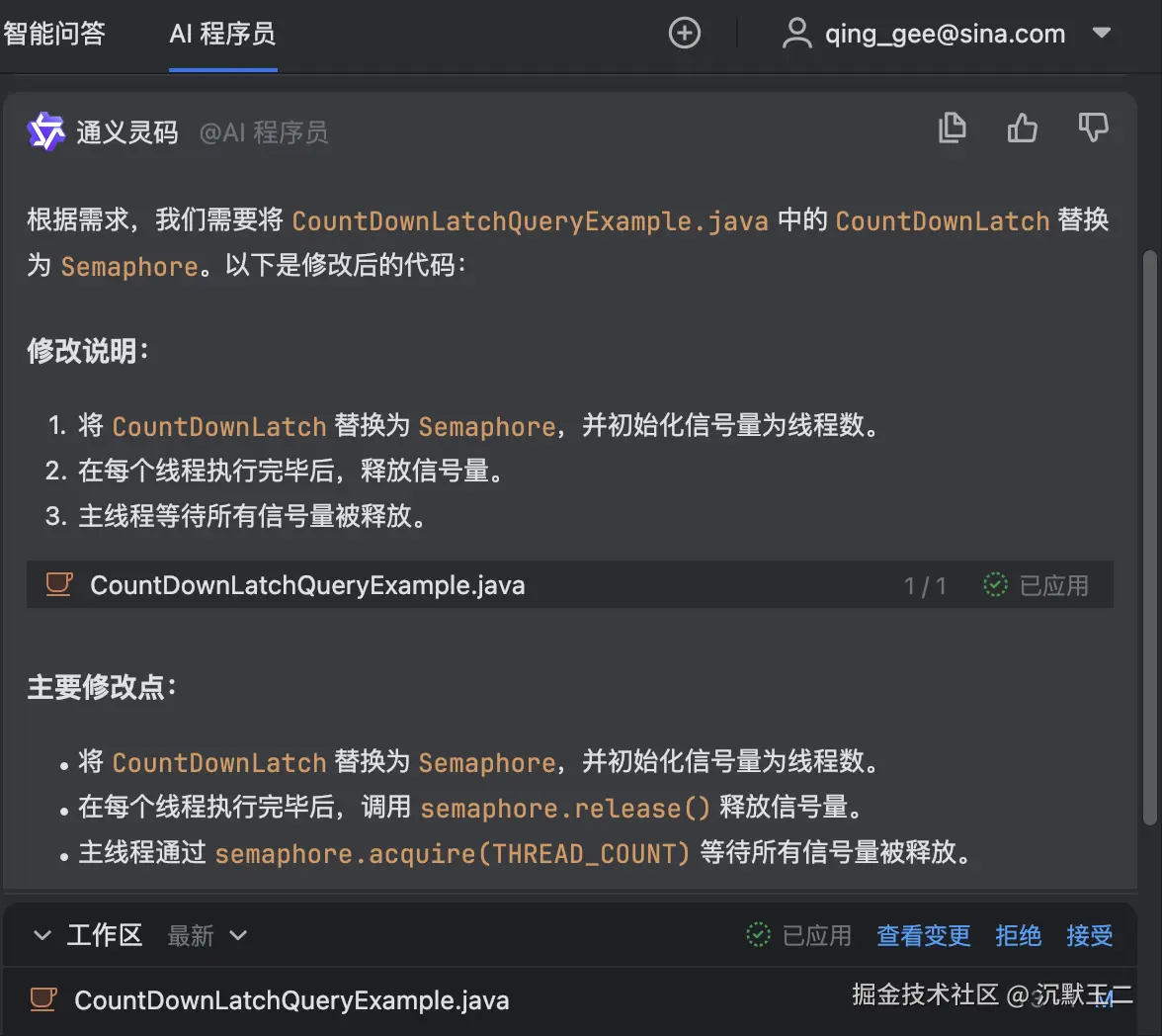 然后直接告诉通义灵码我的需求:“这两个类中都用到了CountDownLatch,我希望你把他们改造成 Semaphore”
