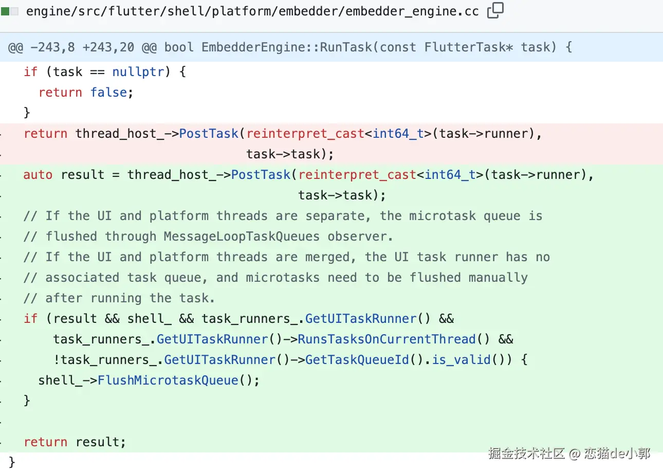 同时,由于过去 UI 和 Platform 线程是分开的,那时的 UI Runner 都是通过独立的 MessageLoopTaskQueues 来处理 microtask 的,而现在线程合并后,UI Runner 变成了 Platform Runner ,自然也就没有关联的任务队列,所以需要在运行任务后需要手动刷新 microtask 。