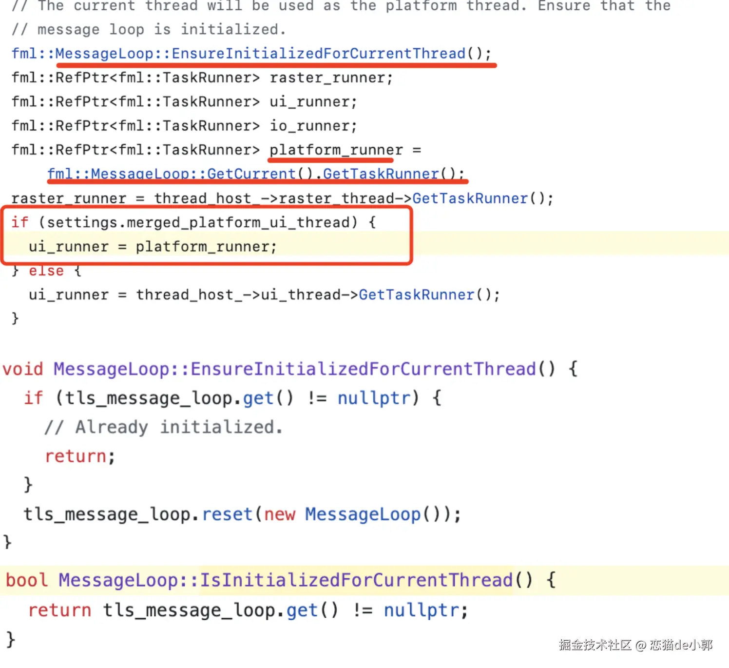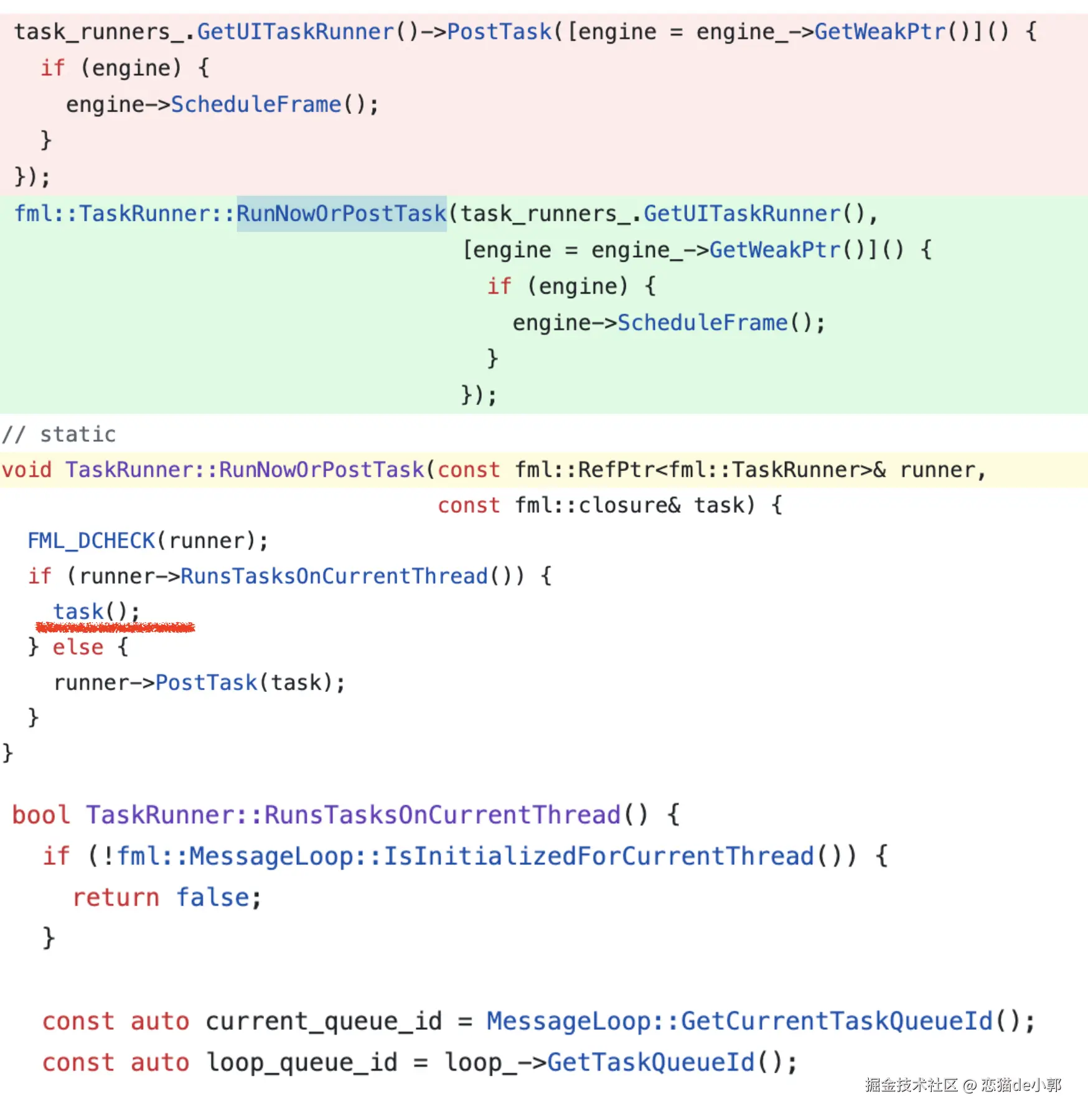 这里再结合前面我们 merged 两个线程时 platform runner 的初始化逻辑,可以看到 MessageLoop 不会是空,所以 IsInitializedForCurrentThread 会是 true ,也就是在当前线程直接运行 task() :