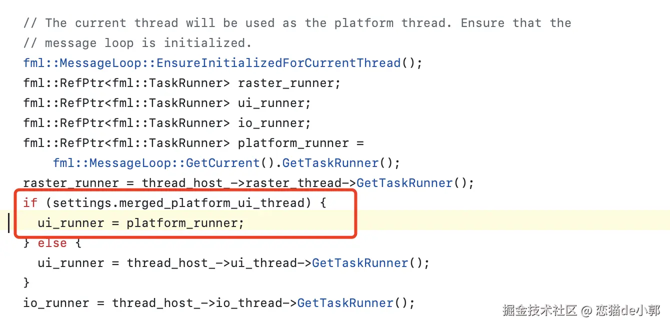 是的,默认情况下现在 merged_platform_ui_thread 会是 true ,也就是 UI Runner 现在等同于 Platform Runner ,那么自然 Dart 的 root isolate 就关联到 Platform Runner 上: