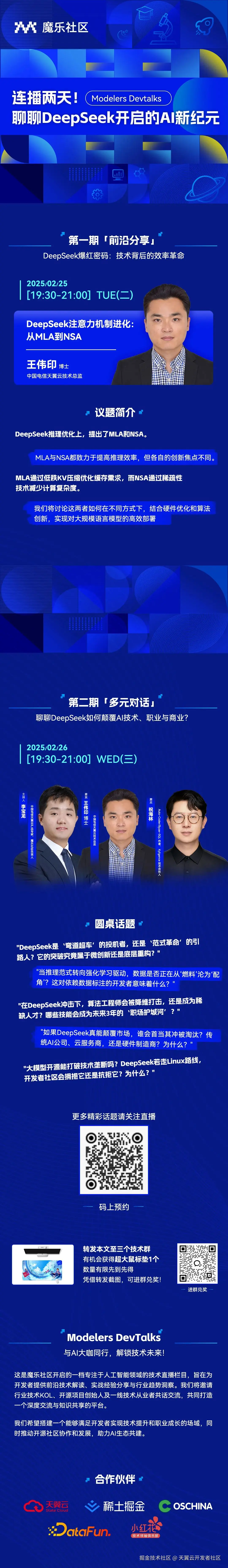 2 月 25 日至 2 月 26 日,魔乐Modelers Devtalk栏目重磅来袭! 同时带来 DeepSeek 系列直播,解析 DeepSeek 爆火背后的效率革命以及对AI技术、职业与商业的影响,带你深度思考DeepSeek背后的关键问题,更有直播福利可领!