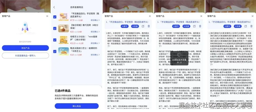 ●AI话术功能的出现再也不用担心话术重复违规了!在直播搭建时,只需选择直播商品,AI就会自动生成直播话术。