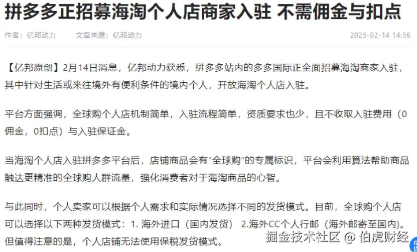 近日,拼多多宣布旗下多多国际将全面招募海淘商家入驻,针对生活或来往境外有便利条件的境内个人,开放海淘个人店入驻,且不收取入驻费用(0佣金,0扣点)与入驻保证金。