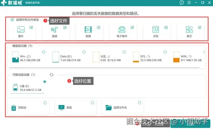 步骤1: 打开这款软件,在软件的主页面按提示选择好文件类型和扫描位置,然后点击 右下角的“扫描”;