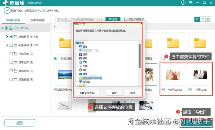 步骤2: 扫描完成后,可以在扫描出来的文件里勾选出自己需要恢复的文件,点击右下角的“导出”;最后再为文件选择存放位置。