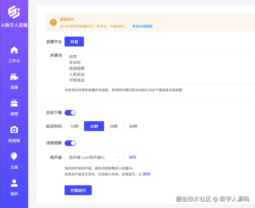 AI直播保镖实时监控抖音直播画面,直播时出现违规提醒、人脸验证时,自动发出警报声提醒,10秒倒计时自动关播。(直播:zhibo175)