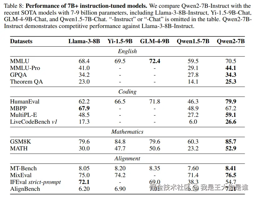 Qwen2-7B-Instruct 。 结果可在表8中 Qwen2-7B-Instruct 在综合评估方面取得了重大进步,尤其是在编码和数学相关任务中取得了更高的分数。与最近的 SOTA模型 Llama-3-8B-Instruct 相比,Qwen2-7B-Instruct 表现出有竞争力的性能,特别是它在编码方面取得了卓越的性能。然而在指令遵循方面,Qwen2-7B-Instruct远远落后于竞争对手为了解决这一限制,我们计划通过提高后训练数据的质量来增强7B模型在指令遵循方面的能力,确保更稳健地理解和执行复杂命令。