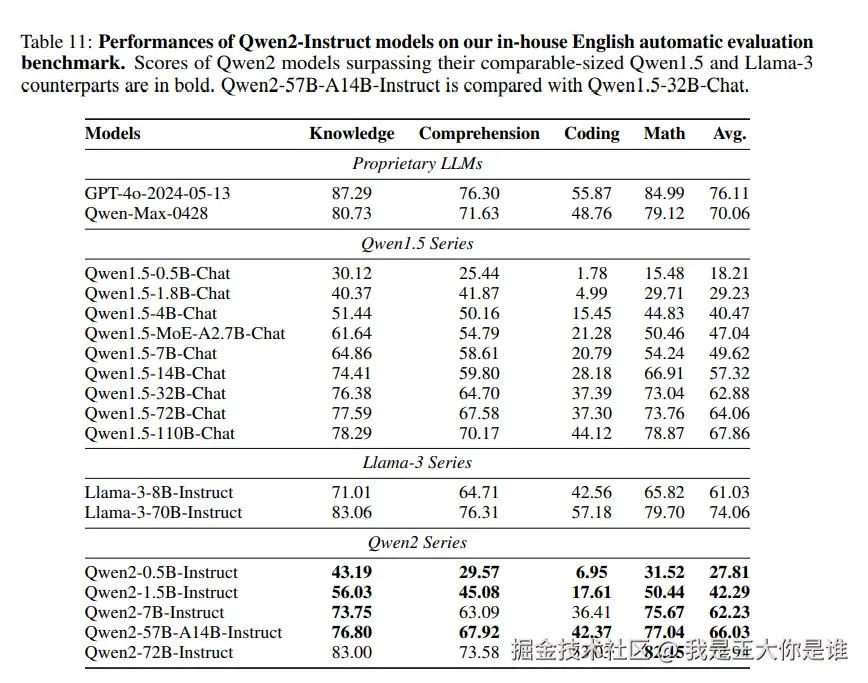 英语评估 。 Qwen2的小型模型显著优于Qwen1.5的对应模型。然而,与Llama-3-70B 相比,Qwen2-72B-Instruct 略微落后,尤其是在理解和编码方面。我们认为预训练中英语 token 的数量以及后训练中数据的数量和多样性导致了英语性能差距。