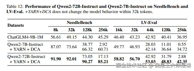 NeedleBench。 NeedleBench 通过包含段落中的多个事实(两个到五个)来增加 NIAH 的挑战,这需要同时识别和多跳推理。表12显示,YARN 和 DCA 的集成显著提高了Qwen2模型的长语境能力。Qwen2-7B-Instruct 超过了声称具有1M 上下文长度的ChatGLM4-9B-1M 。