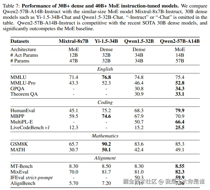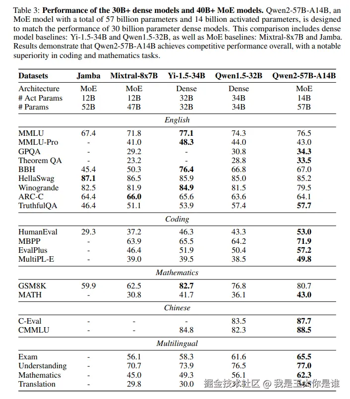 Qwen2-57B-A14B。 为了评估 MoE 模型,Qwen2-57B-A14B 与类似大小的基线进行了比较。这些基线包括其他MoE模型以及密集模型。和 Qwen1.5-32B 两者都约有300亿个参数。结果如表3所示我们预计激活140亿个参数的 Qwen2-57B-A14B 将匹配 300 亿个参数密集等效 Qwen2 模型的性能。我们的评估显示,Qwen2-57B 在自然语言理解任务中与Yi-1.5-34B表现相当。此外,它在编码和数学任务中优于基线模型。此外,Qwen2-57B-A14B展示了强大的中文语言理解能力,堪比更大的Qwen2-72B模型。本质上Qwen2-57B-A14B 是一个高效的模型,在每次前向传递中仅激活 140 亿个参数,同时保持 300 亿个参数密集模型的性能水平。