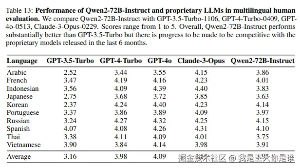 从表13中可以看出, Qwen2-72B-Instruct 显著优于 GPT-3.5-Turbo ,与 GPT-4-Turbo 相当,略微落后于 Claude-3-Opus。这表明我们的多语言预训练和指令调优数据对 Qwen2-72B 的多种语言能力做出了贡献,并且与大多数最先进的专有 LLMs 相当。