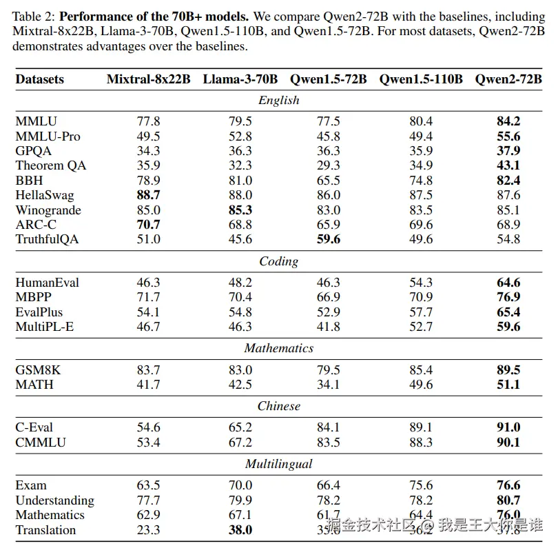Qwen2-72B。 结果如表2所示。Qwen2-72B 在 MMLU 和 MMLU-Pro 的一般知识理解方面均优于Llama-3-70 B 。在科学评估中 Qwen2-72B 表现出优于 Llama-3-70 的优越性。在编码中 Qwen2-72B 超过 Qwen1.5-72B 。在数学方面 Qwen2-72B 优于 Qwen1.5-72B 。Qwen2-72B 显示的推理能力相当于 Llama3-70B,这归功于其改进的编码和数学数据。在评估中文语言理解方面,Qwen2-72B 显著优 于Mixtral-8x22B 、Llama-3-70B 和 Qwen1.5-72B。