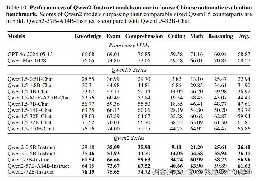 总的来说,Qwen2 系列在不同模型大小上展示了优于基线的性能。值得注意的是,在所有Qwen2模型中,Qwen2-72B表现出最高性能,这强调了型大小扩展的有效性。