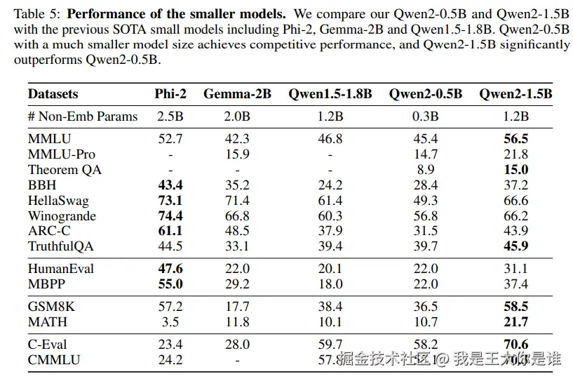 Qwen2-1.5B & Qwen2-0.5B。 为了评估我们较小模型的性能,特别是 Qwen2-1.5B 和 Qwen2-0.5B,我们将其与已建立的基准模型进行比较。结果如表5所示。在语言理解方面,Qwen2-1.5B 优于在类似教科书的数据集上训练的模型 Phi-2。在编码任务中,Qwen2-0.5B 与 Gemma-2B 和 Qwen1.5-1.8B 的表现相当,而 Qwen2-1.5B 除了 Phi-2外,都超过了这些基准模型。与竞争对手相比,Qwen2 的两个模型在数学方面都表现出卓越的性能。在一般推理方面,我们发现 Phi-2 通常优于所有其他模型,这在一定程度上反映了教科书数据对推理能力的重要性。在 TruthfulQA中,Qwen2-1.5B 表现最好,这表明较小的模型不一定会出现幻觉。在中文理解方面,两个Qwen2模型都优于所有其他模型,这一趋势与在各自比较中较大的模型一致。