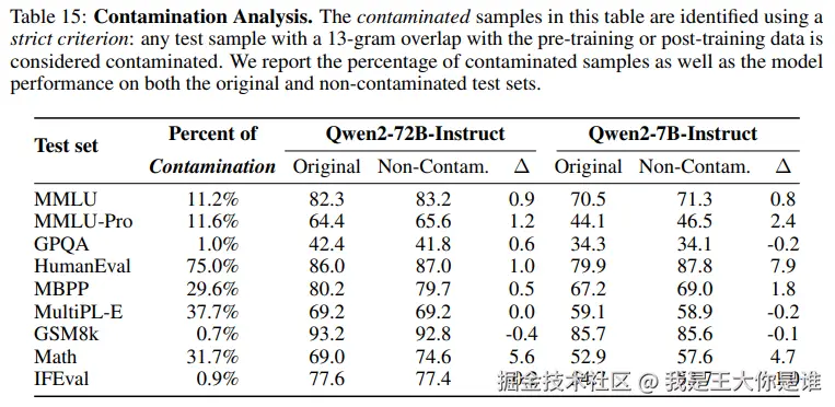 结果如表15所示。虽然一些数据集在严格标准下显示出较高的污染百分比,但我们注意到,大多数被识别为污染样本都是假阳性,主要源于数学和编码数据集。可能因为某些代码片段和数学方程可能非常常见,因此在解决测试数据方面没有提供任何有意义的优势。此外,我们的分析表明,Qwen2 模型在原始和非污染测试数据之间的表现保持一致这表明数据污染的潜在问题没有显著影响模型的性能。