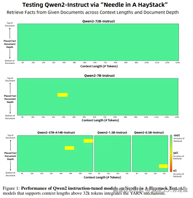 Needle in a Haystack。 这个实验评估模型在大量文本中准确找出事实的能力。文本长度从 8K、16K、…128K 个标记不等,事实被有策略地定位在不同的深度 。每个深度间隔,例如从 0 %到 10 %,包含两个实例。对于超过 32K 的上下文,在本次评估中使用了 YARN 。如图1所示,Qwen2-72B-Instruct 在从整个1 28K 上下文中检索信息方面表现出色。结合其内在优势,该模型成为处理大量文本的最佳选择,前提是可获得足够的资源。此外,同一系列中的模型在不同上下文长度上展示了卓越的性能。具体来说,Qwen2-7B-Instruct 在处理最多 128K 个标记的上下文时达到了高水平的准确性。 Qwen2-57B-A14B-Instruct 能够熟练地管理最多 64K 个标记的上下文 ,而Qwen2系列中的两个较小模型可以支持最多32K个标记的上下文。
