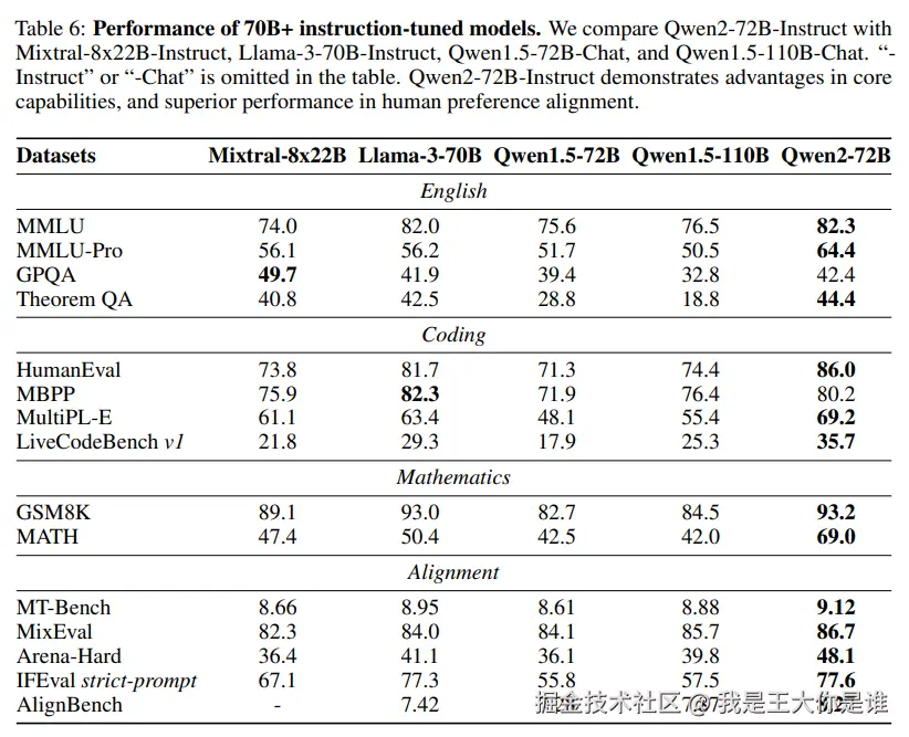 Qwen2-72B-Instruct。 结果如表6所示。强大的基础语言模型有助于提升指令调优模型的下游性能。具体来说,Qwen2-72B 在语言理解、编码和数学等领域表现突出,除了GPQA和 MBPP ,Qwen2-72B相对于基线模型具有显著优势。我们认为这一成就既归功于高质量的预训练模型,也归功于训练后训练的数据和技术的改进。