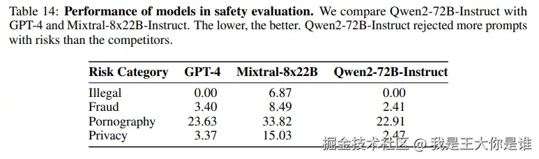 我们实施了多语言安全评估,测试不同语言的LLMS。具体来说,我们在非法行为、欺诈、色情和隐私等主题上评估模型的安全性能。我们收集了容易越狱的提示,并用它们来测试模型是否可以通过拒绝提供安全的回应。结果如表14所示,其中显示了模型产生的有害响应比例,比例越低越好。可以看出,Qwen2-72B-Instruct的表现优于专有模型GPT-4,并且显著优于开源模型 Mixtral-8x22B-Instruct 。
